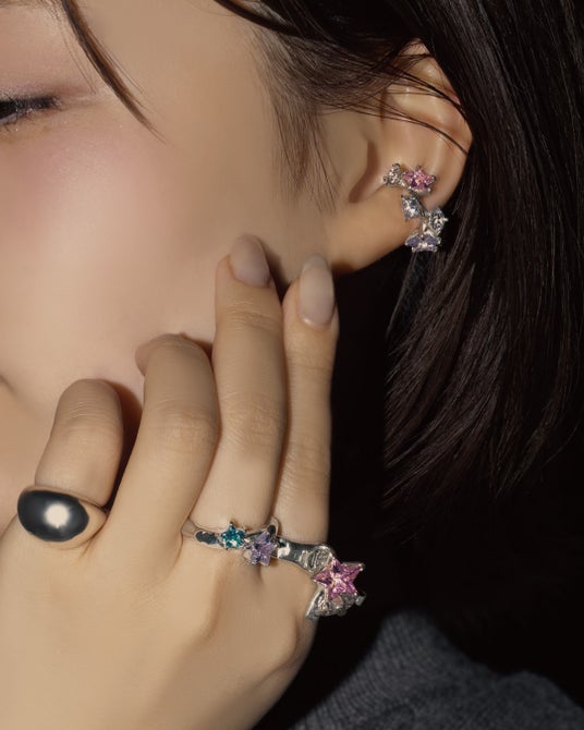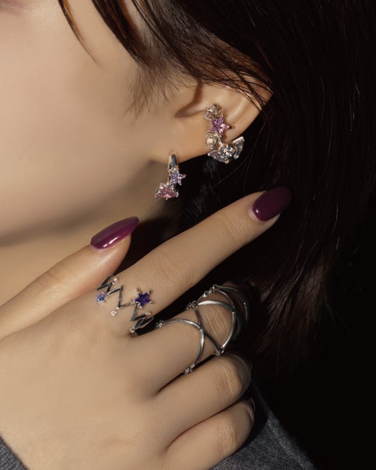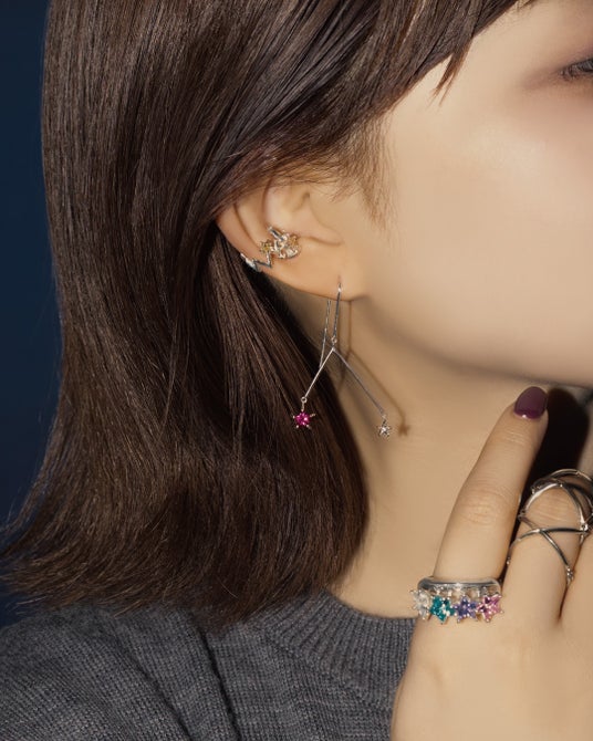 星座フォルムのデザインはイヤーカフで登場。ピアスとのコーディネートはもちろん、ピアスホールが開いていなくても顔周りを華やかに演出できます。