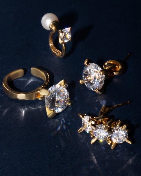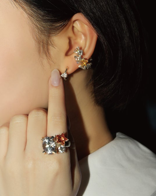 様々な方向にセッティングされたストーンがふんだんに光を取り込み、顔周りを華やかに演出するイヤーカフやピアス。