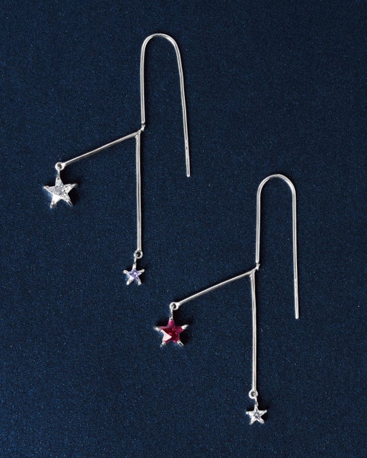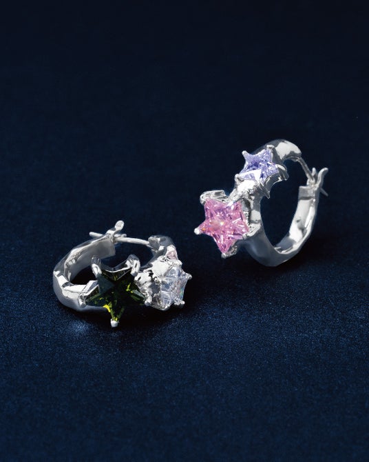 大小2つのスターが寄り添うピアスは着脱しやすいフープタイプ。デザイン自体はベーシックなので、選ぶカラーによってシックにもカジュアルにも見せられます。