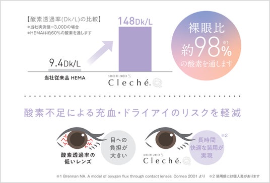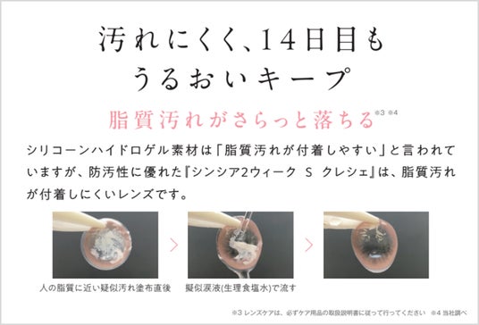 『クレシェ』は、目への負担が少ない素材(シリコーンハイドロゲル素材)を使った、クリア(透明)のコンタクトレンズと同スペックのカラー・サークルコンタクトレンズです。レンズ自体が酸素を通すため、高い酸素透過率が特徴で、裸眼と比較して約98%※1の酸素を通します。また、シリコーンハイドロゲル素材は「脂質汚れが付着しやすい」と言われていますが、防汚性に優れた『シンシア2ウィーク S クレシェ』は、脂質汚れが付着しにくいレンズです。※3 ※4※1 Brennan NA. A model of oxygen flux through contact lenses. Cornea 2001より ※2 装用感には個人差があります ※3 レンズケアは、必ずケア用品の取扱説明書に従って行ってください ※4 当社調べ