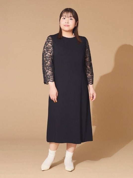 袖をフラワー柄のレース地で切り替えたきれいめワンピース。透け感のある袖は、品よく見せつつ軽やかさもプラスしてくれます。ストンと落ちるIラインシルエットが美しく、身体を締め付けずにゆったり着用できるのも嬉しいポイントです。