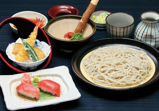 本まぐろのにぎり寿司(中とろ・赤身)と更科蕎麦、天ぷらが味わえる御膳メニューです。