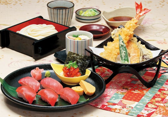 本まぐろの中とろ2貫、赤身3貫、ピリ辛ユッケ1貫を盛り付けた豪華なお寿司に加え、揚げたての大海老天ぷら、自家製の茶碗蒸し、自慢の手延べうどんがお楽しみいただける贅沢な御膳メニューです。