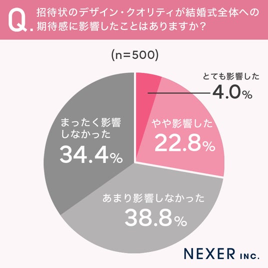 一方で「あまり影響しなかった」は38.8%、「まったく影響しなかった」は34.4%と、7割以上は招待状のデザインで結婚式への期待感が大きく左右されることはなかったようです。