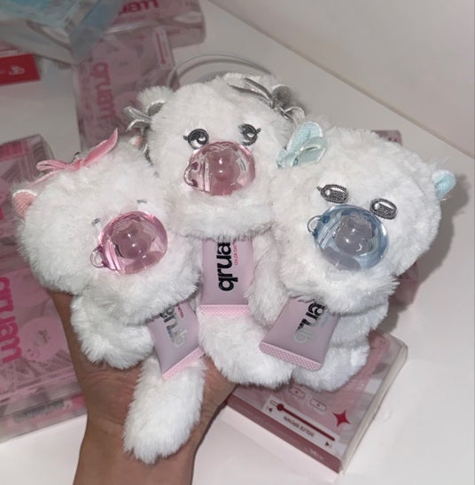 購入特典にはqruamオリジナルキャラクターのぬいぐるみをご用意しました。カラーデイリップマスクを抱きかかえてくれる3色の猫たちと一緒におでかけ♫
