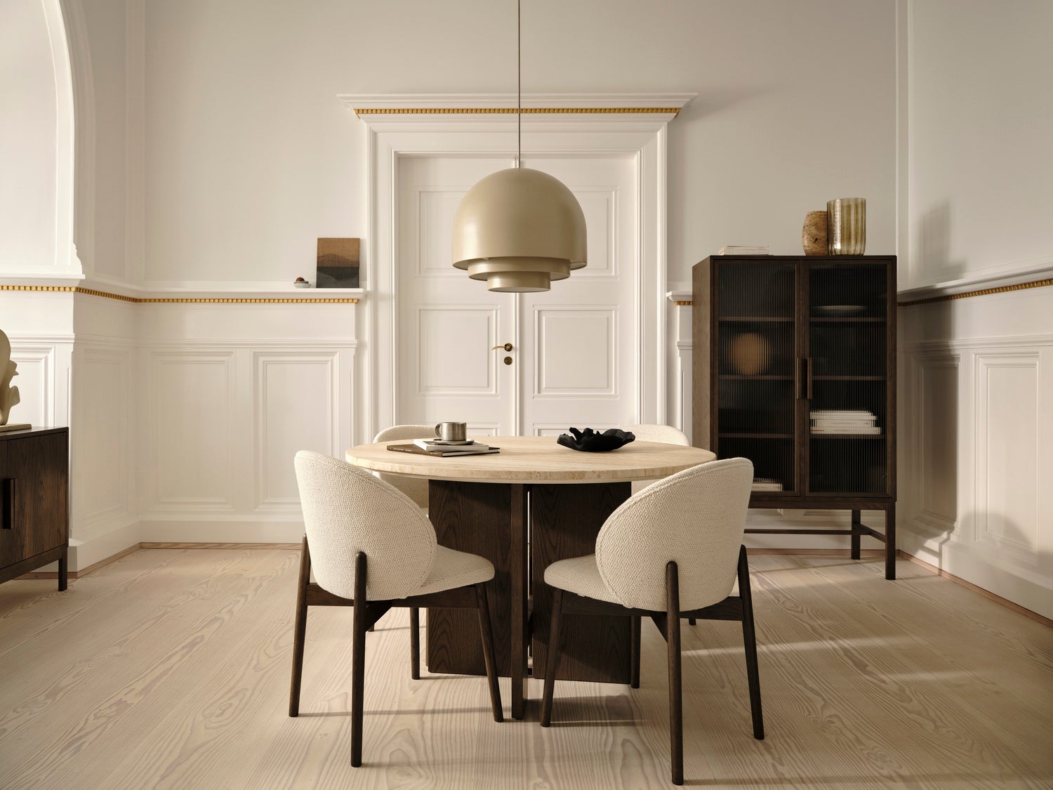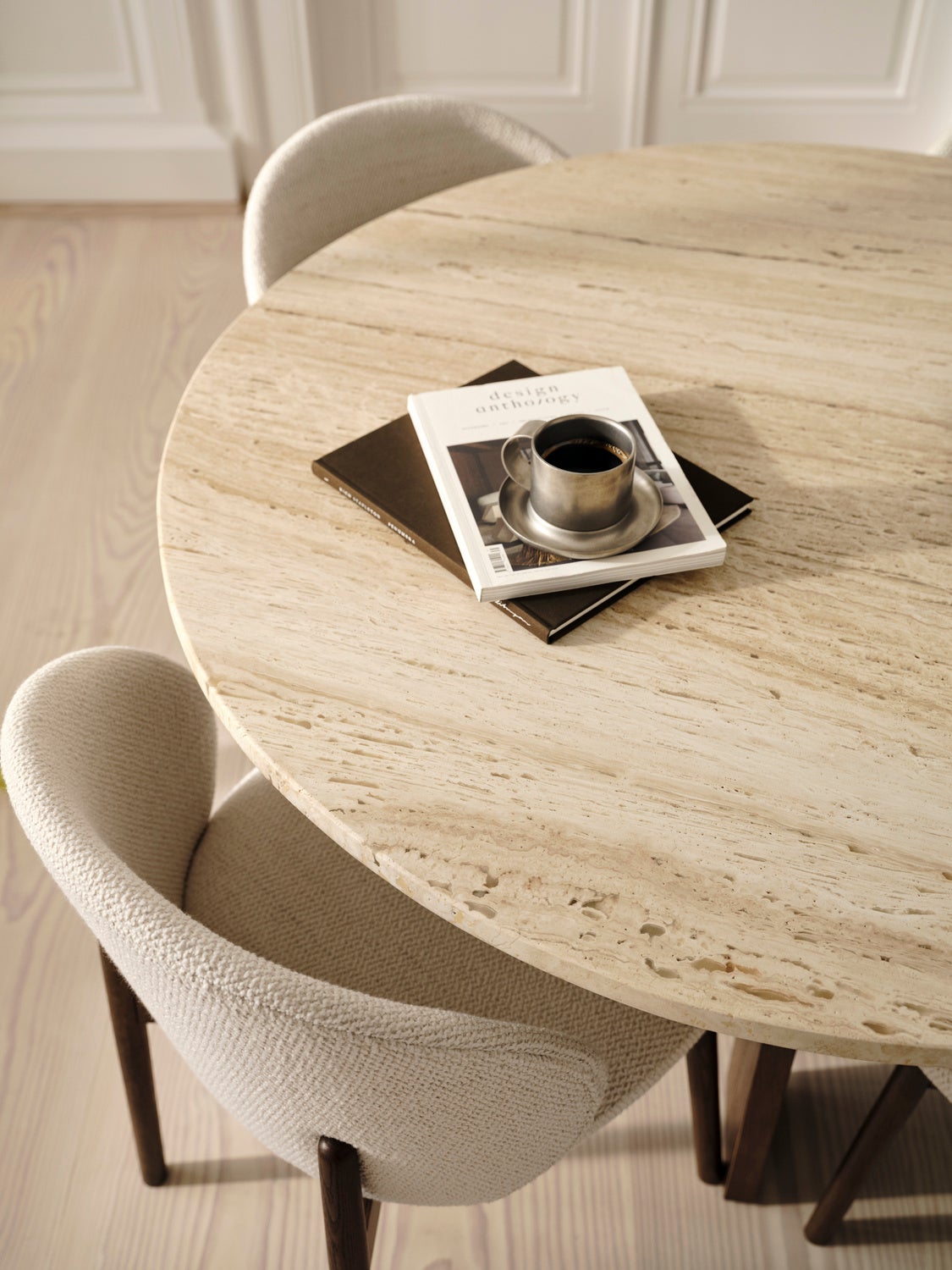ナチュラルオークおよびダークオークべニアを用いて仕上げられ、木そのものの触感や奥行きのある表情が豊かに表現されています。また、コレクションの象徴的な存在であるトラバーチンのラウンドダイニングテーブルは、天然の石目によって、一点一点が異なる表情を持つ、唯一無二の存在です。