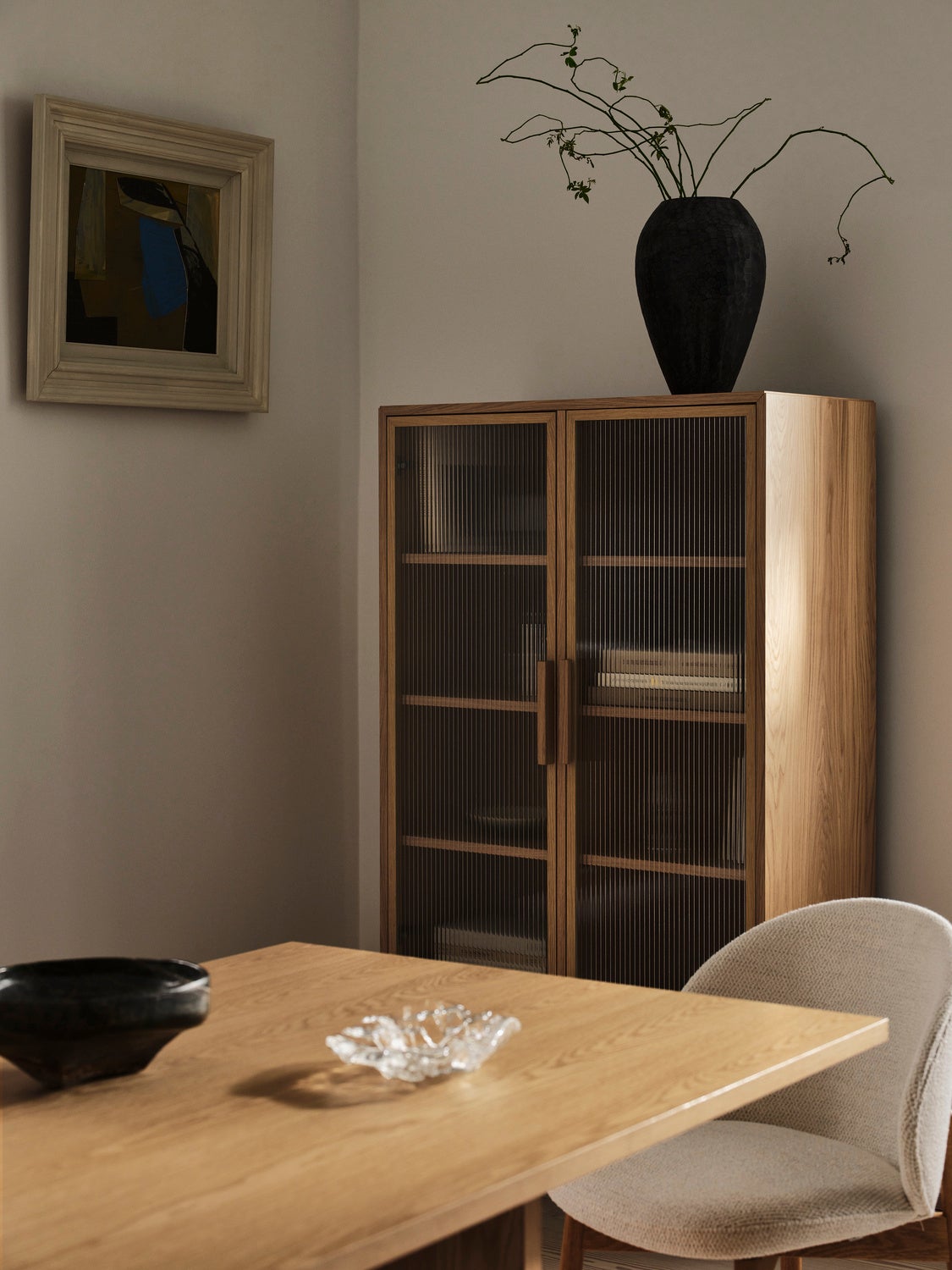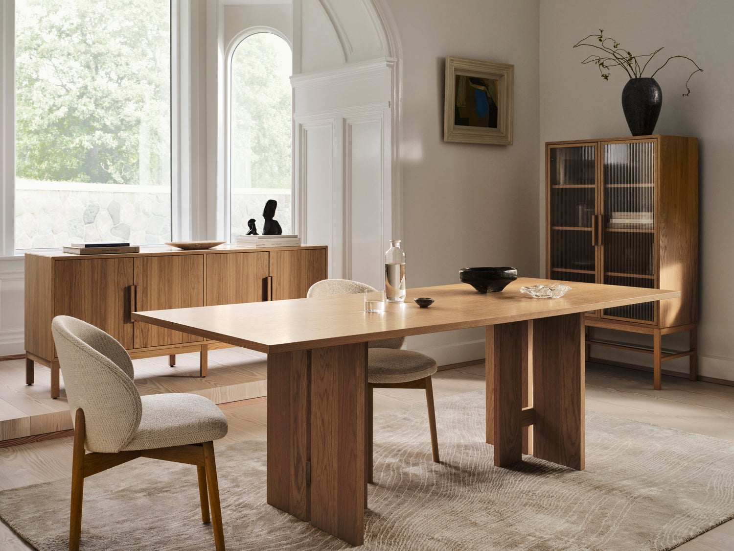 axoコレクションは、統一感のあるダイニングのあり方を提案しています。テーブルに加え、サイドボードやガラス扉のキャビネットを展開、ダイニングとリビングを自然につなぐ、柔軟な空間づくりを可能にしています。キャビネットに用いられた、波打つようなフロストガラスは、静かな個性を添えるディテールです。