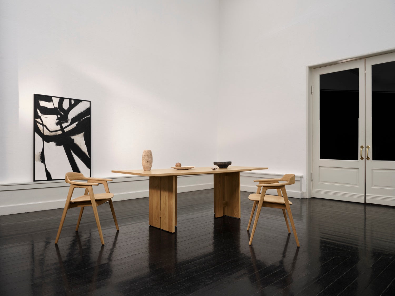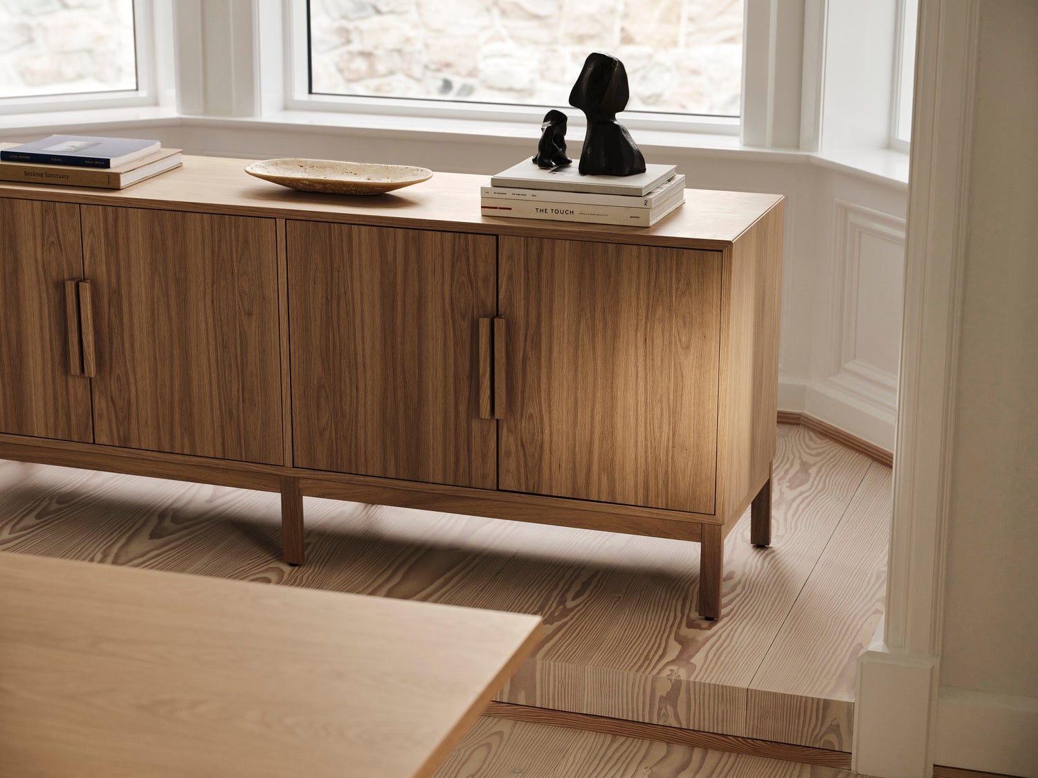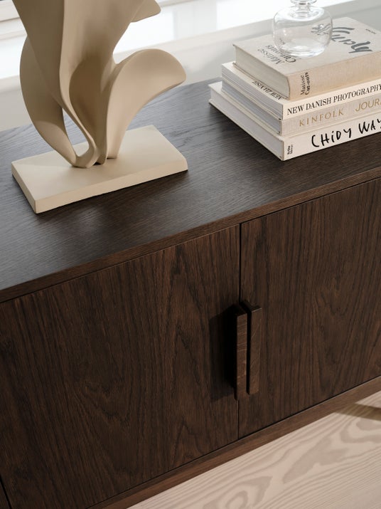 atelier axo の建築的なバックグラウンドは、エレガントなテーブル脚の佇まいや、キャビネットの端正な構造など、コレクション全体の彫刻的なプロポーションに表れています。