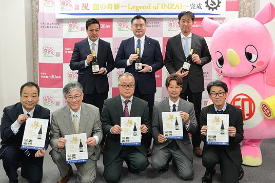 印西市商工会では、印西市の活性化を目的に令和6年度から「日本酒プロジェクト」を推進してきました。このたび新酒「龍の奇跡~Legend of INZAI~」が醸造されたことに伴い、初の公式なお披露目として令和8年4月7日(火)に市を表敬訪問。印西市商工会から藤代市長へプロジェクトの概要説明と完成報告、ボトルの披露が行われました。