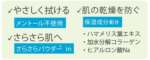 汗・皮脂を吸着するさらさらパウダー*配合。やわらかな厚手シートで、汗やベタつきをしっかりと拭き取り、心地よい香りで整えます。メントール不使用のやさしい使用感だから親子でお使いいただけます。