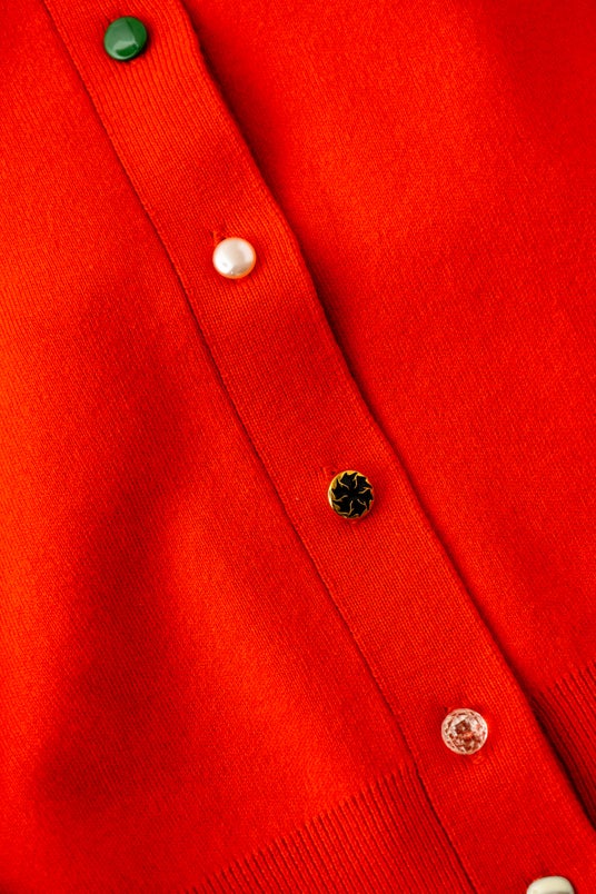 発売初日に完売し、今回数量限定で再入荷するカーディガンは、ブランドのマスターピースである『コットンカシミヤ クルーネックカーディガン』に、パリの蚤の市で買い付けたアンティークボタンをあしらった特別な一着。