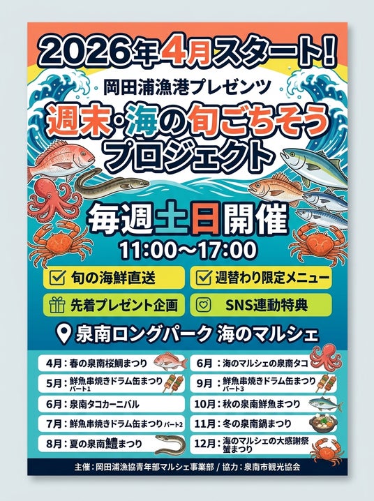 期間:2026年4月の毎週土日(詳細日程は公式Instagramで発表)時間:11:00~17:00会場:泉南ロングパーク「海のマルシェ」内特設会場
