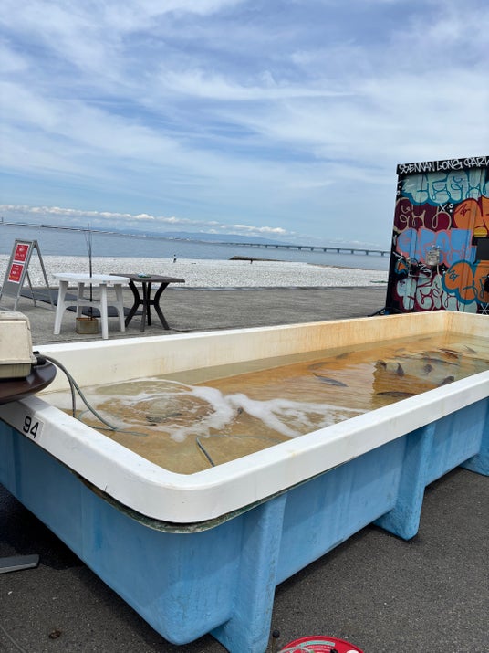 関西国際空港を背景に大きな生簀で鯛釣体験
