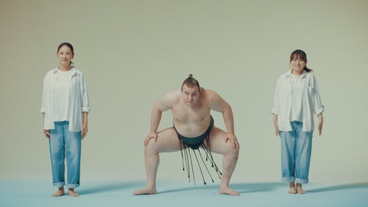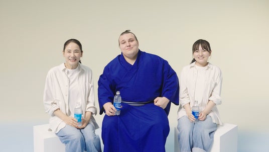 「人のカラダの約60%は水分と電解質でできています」。そんなメッセージとともに、「はっけよい、のこった」の合図で自身のカラダの水分量が入った袋を持ち上げます。必死に持ち上げようとする吉田羊さんと鈴木梨央さんですが、あまりの重さに大苦戦。一方、日々の鍛錬で鍛え上げられた安青錦関は袋を軽々と持ち上げます。カラダの大部分を占める水分の大切さをユーモラスに表現しながら、最後は3人が並んでポカリスエットを飲むシーンで締めくくられます。