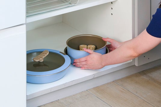 専用ハンドルがフライパンから外せるので、フライパンやポットを重ねて収納できます。ごちゃつきやすいキッチン収納庫もコンパクトにスッキリします。