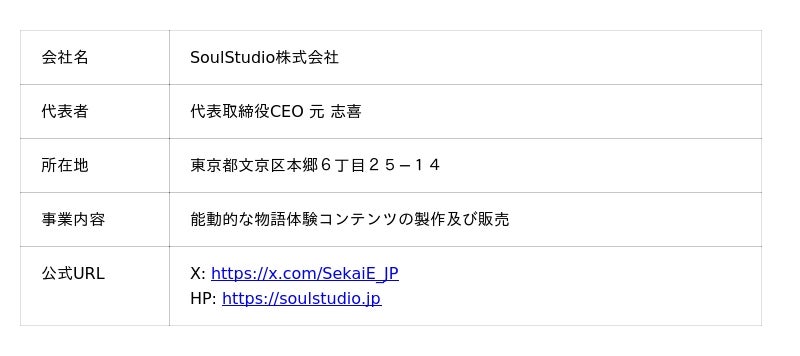 SoulStudio(旧 セカイヘ)は「作品世界を生きられる未来を創る」というビジョンのもと、受け手が作品世界の住民となって能動的に物語を体験できるコンテンツを製作する会社です。2023年9月に設立された東大発スタートアップです。複数のアニメ作品におけるSoulChatコンテンツを製作し、提供しています。
