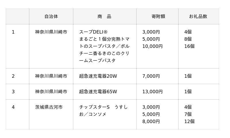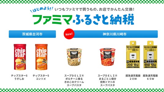 神奈川県川崎市からは、お湯を注ぐだけで手軽に小腹を満たせる「スープDELI(R) まるごと1個分完熟トマトのスープパスタ/ポルチーニ香るきのこのクリームスープパスタ」のほか、スマートフォンやPCの充電に欠かせない、「超急速充電器(20W/65W)」が登場いたします。また、茨城県古河市からは、おやつや行楽のお供に長年親しまれている「チップスターS(うすしお/コンソメ)」が仲間入りします。