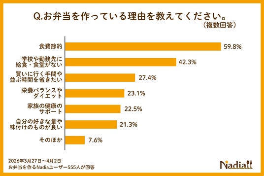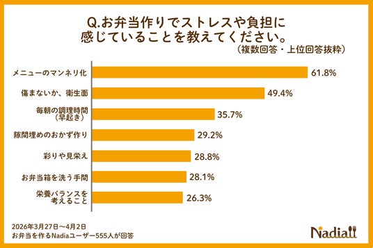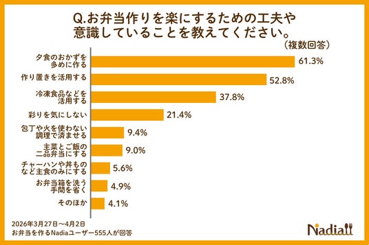 Nadia株式会社(東京都港区/代表取締役社長 葛城嘉紀)が運営する料理メディア「Nadia(ナディア)」(URL:https://oceans-nadia.com/)は、「お弁当作り」に関するアンケート調査(※1)を実施しました。