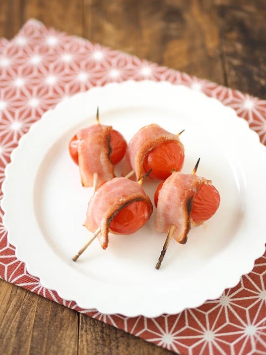 ミニトマトにベーコンを巻いてトースターで焼くだけ!