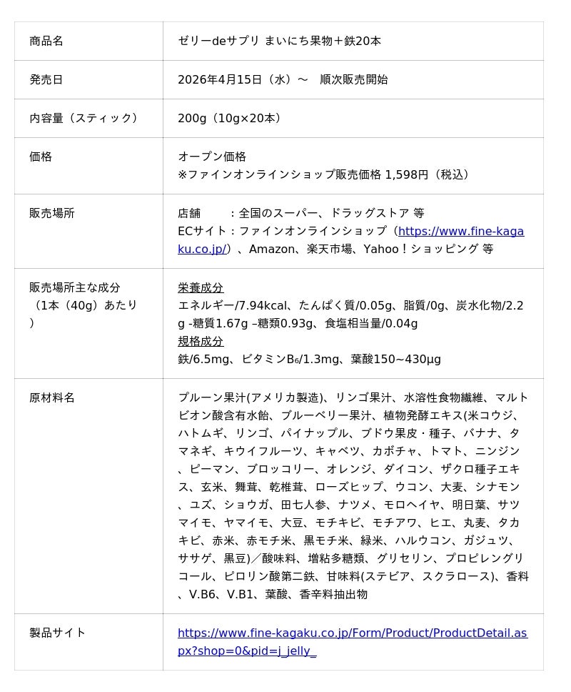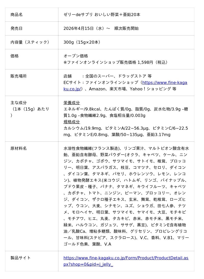 健康食品および医薬品などを製造・販売する株式会社ファイン(本社:大阪市淀川区、代表取締役:佐々木 信綱)は、手軽に栄養補助できる「ゼリーdeサプリ」シリーズのパッケージをリニューアルし、「ゼリーdeサプリ おいしい野菜+亜鉛20本」 「ゼリーdeサプリ まいにち果物+鉄20本」を2026年4月15日(水)より発売いたします。全国のドラッグストア、ファインオンラインショップのほか各種公式ECサイト(Amazon公式、楽天市場公式、Yahoo!ショッピング)にて順次販売してまいります。