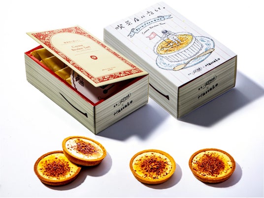 まるで物語の1ページをめくるようパッケージのワクワク感も魅力の「クレームブリュレタルト」は、パリとろ食感がたまらない絶品ひと口ブリュレ。 バニラ香るプディング風クリームの表面を直火でパリッとキャラメリゼしてあり、割るとクリーム層の下からほろ苦いキャラメルソースがとろりとあふれ出します。