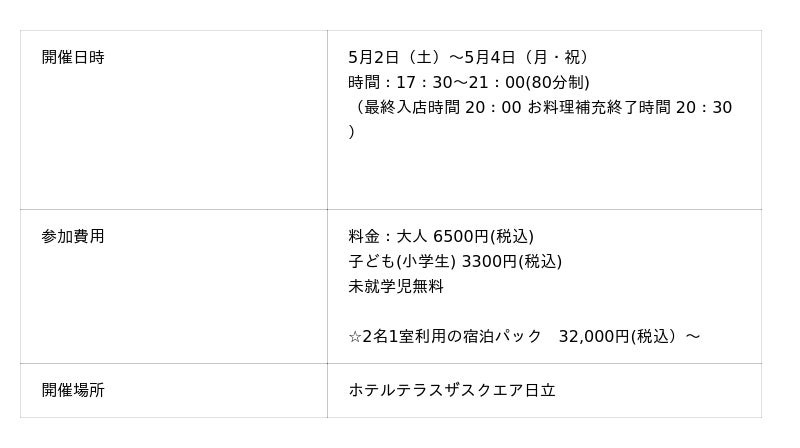 GW3日間だけのディナーバイキング付き宿泊プラン(2名一室2食付)32,000円~※