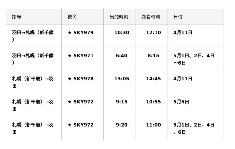 ■2026年4月/5月『羽田=札幌(新千歳)』線、『札幌(新千歳)=羽田』線臨時便一覧