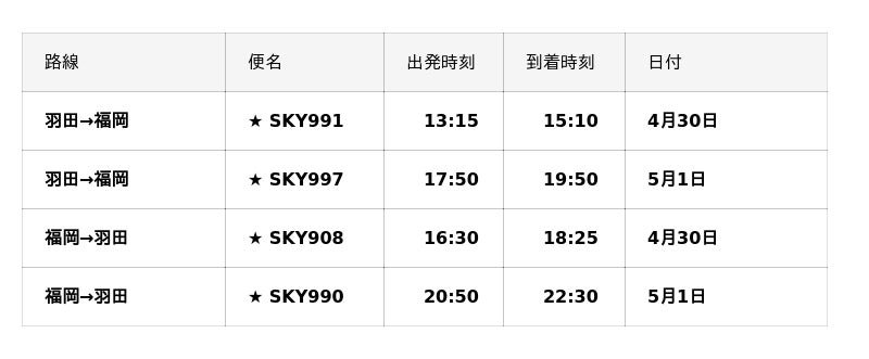 ■2026年4月/5月『羽田=福岡』線、『福岡=羽田』線臨時便一覧