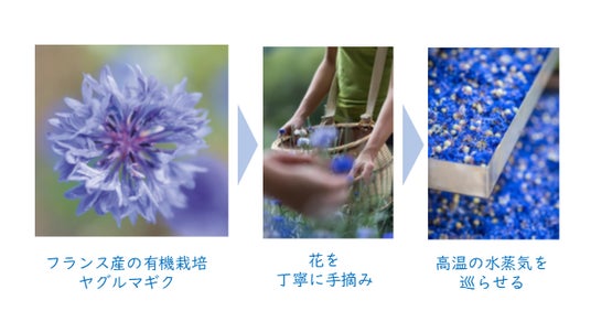 そのヤグルマギクの花を水蒸気蒸留し、有効成分を優しく抽出しました。