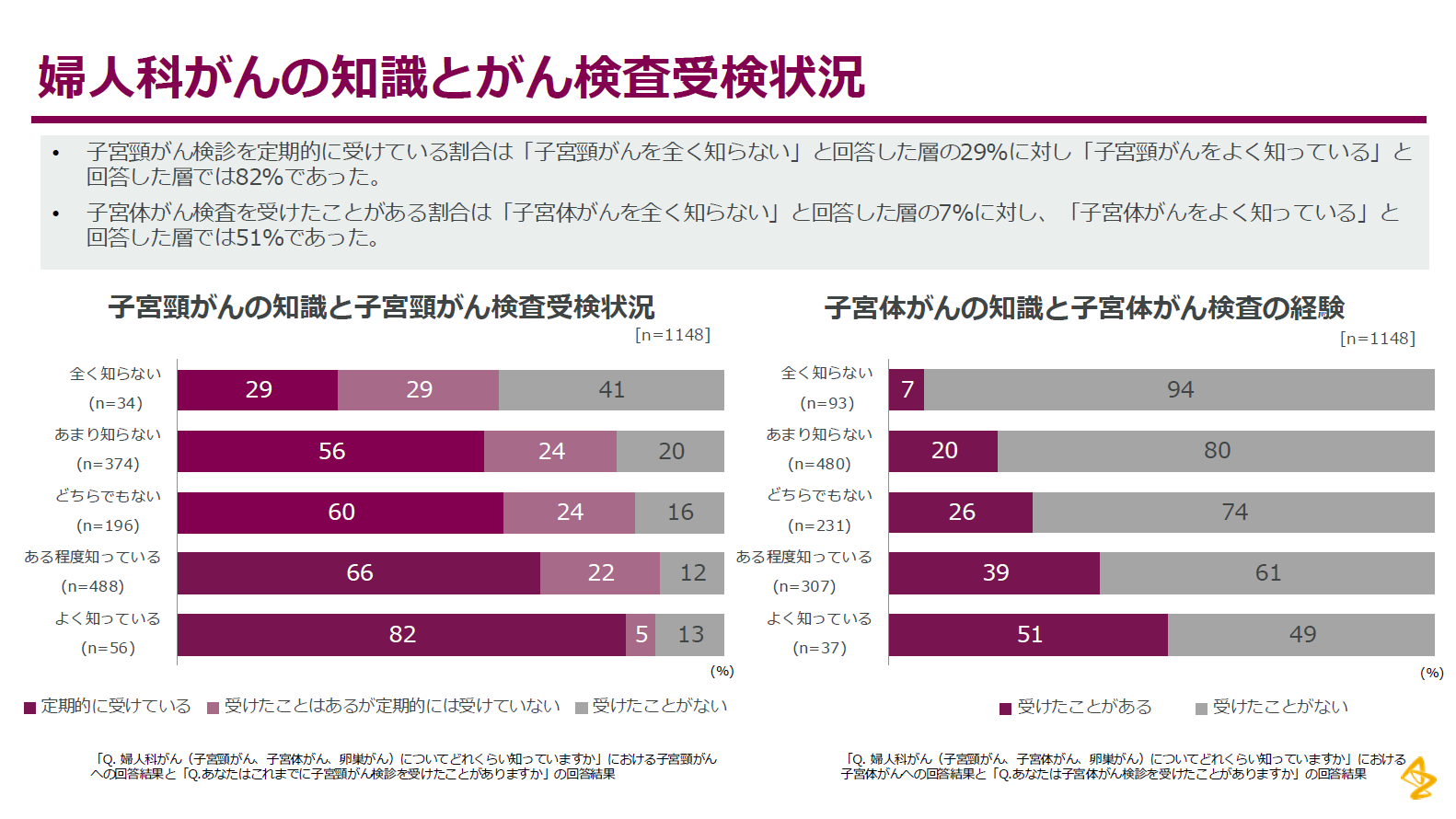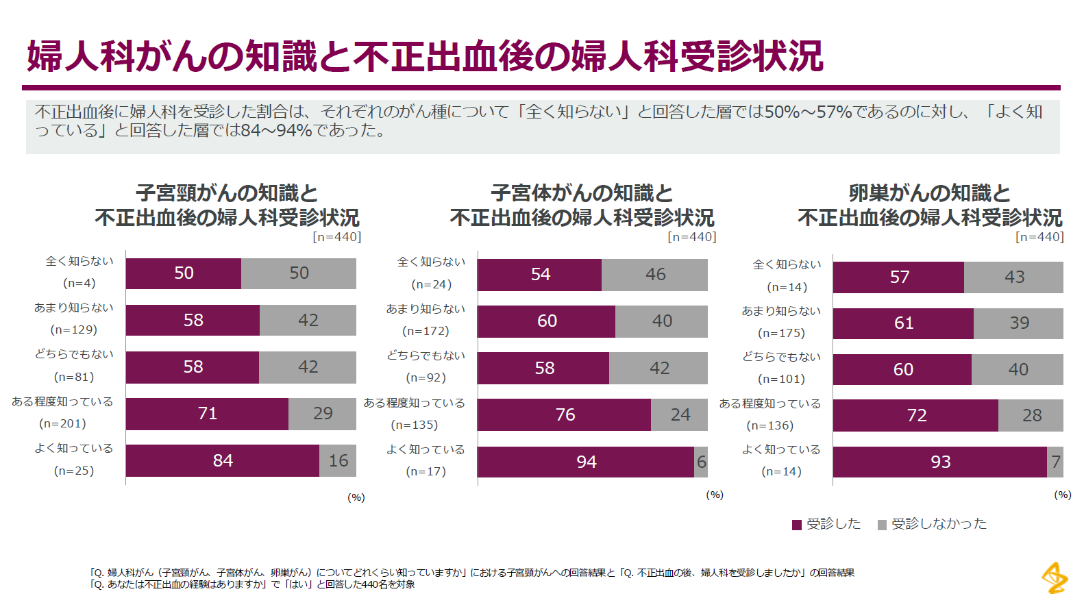 また、梅宮アンナさんと西丸優子さんをゲストに迎え、吉田ゆりさん、温泉川真由先生とともにクロストークセッションを実施しました。参加企業の女性従業員1148名を対象にイベントに先立って事前に実施された「婦人科がん認知および受療行動に関する調査」結果に触れながら、検診の意義や早期発見の重要性、治療とキャリアの両立について議論しました。調査からは、女性従業員に対する婦人科がんの情報提供が、婦人科がんの検査受検および不正出血があった際の受診行動に寄与する可能性が示唆されました。