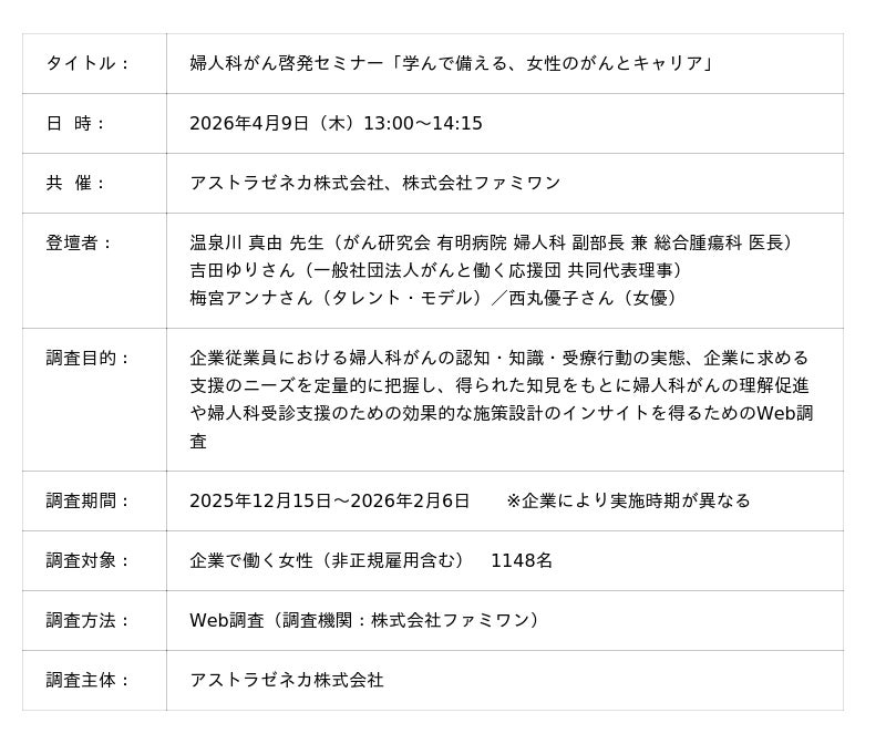 アストラゼネカ株式会社(本社:大阪市北区、代表取締役社長:アンドリュー・バーネット、以下、アストラゼネカ)は、「子宮の日」である4月9日(木)に、婦人科がん啓発セミナー「学んで備える、女性のがんとキャリア」を開催しました。本セミナーは、女性のライフステージの変化にともなう健康支援サービスを中心に展開する株式会社ファミワンとの共催イベントとして行われ、婦人科がんに対する知識を高めるとともに検診の意義を知ることで、早期発見や婦人科の受診促進を目的に50社を超える企業で働く女性従業員を対象に行われました。