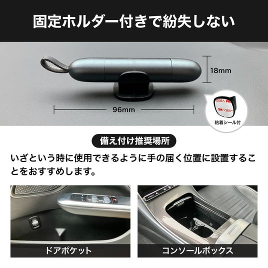 - シートベルトカッターを内蔵し、緊急時の脱出行動を補助