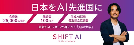 株式会社SHIFT AIは、「日本をAI先進国に」というミッションのもと、生成AIをはじめとするAI技術のビジネス活用を学べる、利用者数No.1※の生成AI学習コミュニティ「SHIFT AI」を運営しています。会員数は3万人を超え、法人向けのリスキリング支援サービス「SHIFT AI for Biz」や、教育機関向けの「SHIFT AI for School」など、幅広い分野でAI人材の育成を推進。さらに、独自メディア「SHIFT AI Times」の運営をはじめ、情報発信・研修・イベントを通じて、個人と組織の成長を支援し、日本全体のAI活用を加速させています。