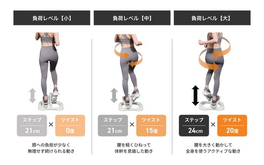 運動の目的や体力に合わせて、運動強度を調節できます。ステップのストローク幅とツイスト可動域の負荷を組み合わせることで、膝への負担の少ない軽めの運動から腰まわりまでしっかり動かす全身運動まで対応。無理なく続けやすく、運動習慣づくりをサポートします。