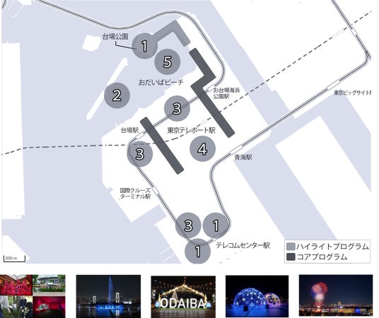 1.国際美術展 TOKYO ATLAS 2.東京アクアシンフォニー 3.イルミネーションアイランドお台場 4.臨海副都心イルミネーション※開催エリアは調整中(上記地図はイメージ) 5.お台場レインボー花火