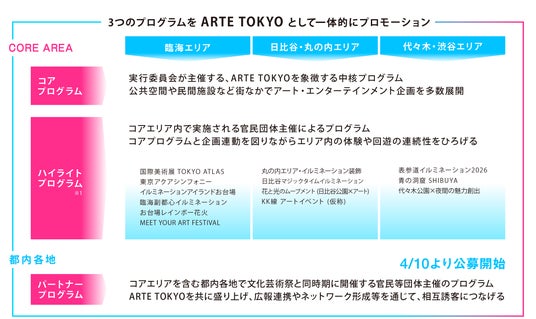 初開催となる2026年は、臨海エリア、日比谷・丸の内エリア、代々木・渋谷エリアをコアエリアに、様々な催しと連動しながら、公園や水辺などの街なかで東京2020大会文化プログラムのリバイバルをはじめとする多数のアートやエンターテインメント企画を展開します。