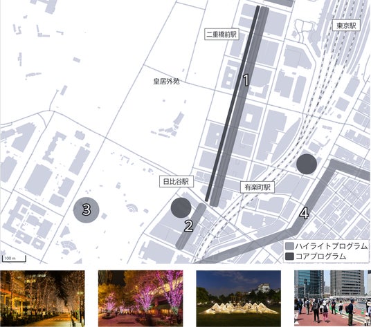 1.丸の内エリア・イルミネーション装飾※昨年の様子 2.日比谷マジックタイムイルミネーション 3.花と光のムーブメント(日比谷公園×アート) 4.KK線アートイベント(仮称)
