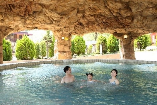 【スプリングハウス】岩がごつごつした秘境の温泉を想わせる温浴スポットは、お子様はもちろん、お父さん、お母さんの遊び疲れた体を優しく温めてくれます。