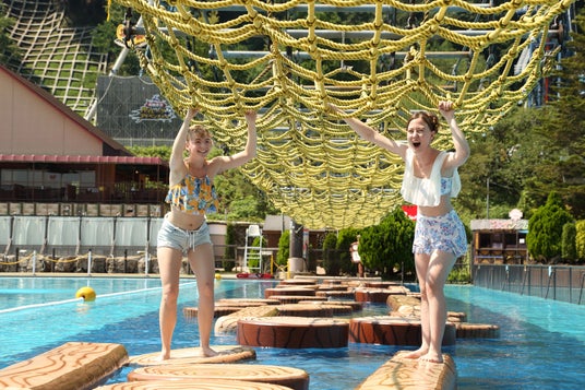 【スーパーモンキーフロート】バランス感覚と身軽さに自信のある人はここに集合!バランス感覚が試される!?プールを横断する浮島の群れをプールに落ちないように渡り切れるか!?