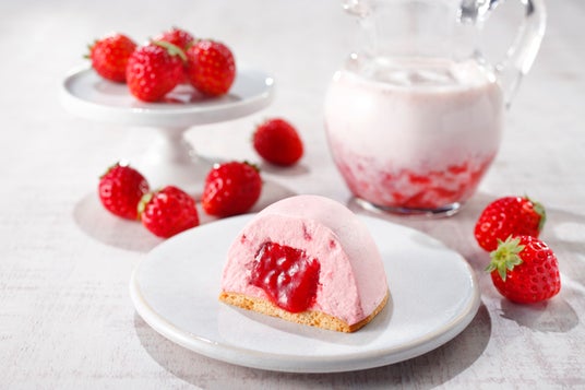 華やかなイチゴの色味に合わせて3種のベリーピューレで仕上げたジュレをイチゴピューレと生クリームで仕上げた優しいコクの広がるムースで包み込みました。イチゴの甘酸っぱさとミルクの口溶けが絶妙なマリアージュとなって口いっぱいに広がります。