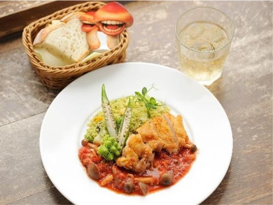 世界最小のパスタ「クスクス」を爽やかなバジル風味に仕上げ、しめじを絡めたトマトソースに、旨み豊かな「但馬すこやかどり」をトッピング。しめじは、きみょい植物展に登場する、笑う宇宙植物“ゲラナダケ”をイメージしています。