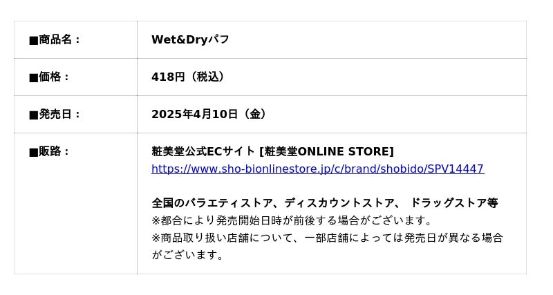 化粧品、化粧雑貨、服飾雑貨及びキャラクター雑貨等の企画・製造・販売、コンタクトレンズの企画・販売を行う粧美堂株式会社(本社:東京都港区、代表取締役社長:寺田正秀、以下 粧美堂)は、ぷるっと水で膨らんで光沢肌メイクを演出する※「Wet&Dryパフ」を、2026年4月10日(金)より発売しました。