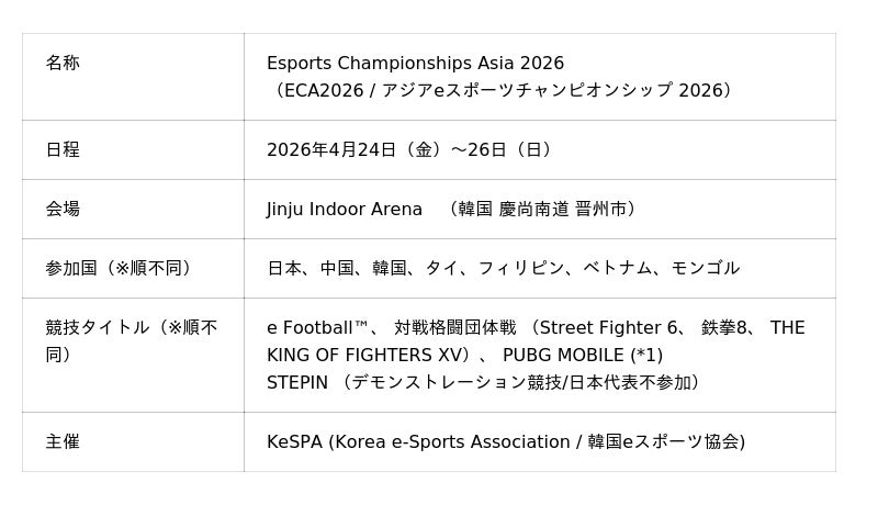 一般社団法人日本 e スポーツ協会(会長:早川英樹 以下、JESU)は、4月24日(金)から韓国で開催される「アジアeスポーツチャンピオンシップ 2026」(Esports Championships Asia 2026、以下ECA 2026)に、日本代表選手団を派遣することをお知らせします。