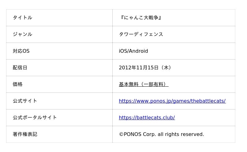 ポノスは、1990年の創業以来一貫してゲームを通してエンターテインメントという文化の発展に貢献してまいりました。【求められるモノは創らない、それ以上を創り出す。】を掲げ、求められるモノの中に、自分たちしか創れない価値をプラスしていくことを私たちは大切にしています。現在は、スマートデバイス向けのオリジナルゲーム開発を核に事業を展開し、代表タイトル『にゃんこ大戦争』は、累計DL数1億1111万回(2026年3月現在)を超え、多くのお客様に楽しんでいただいております。