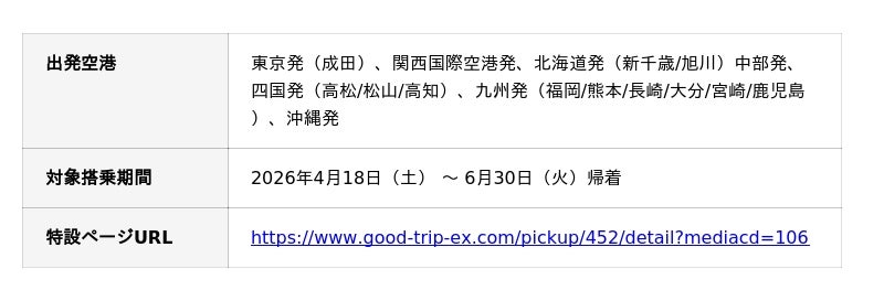 旅行予約サイト『グッドトリップエクスプレス(グットリ)』を運営する日本空輸株式会社(本社:東京都港区、代表取締役:岡下 敏也)は、これからの行楽シーズンに向けて、ジェットスタージャパン(ジェットスター)の広範な路線網を活用した「国内ツアー特集」を公開しました。特に人気が集中する沖縄・九州・北海道などのリゾートエリアも、LCCならではの価格帯で、初夏の国内旅行がさらにお得にご利用いただけます。