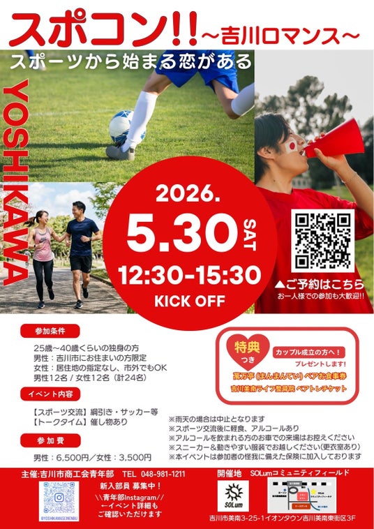 埼玉県吉川市商工会青年部(所在地:埼玉県吉川市平沼、代表:大熊 豪)は、吉川市内において「スポコン!!~吉川ロマンス~ スポーツからはじまる恋がある」を2026年5月30日に開催いたします。吉川市での恋をサポートして地域発展のお手伝いをさせていただきます。