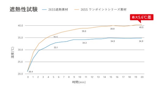 最大-5.6℃ソーラーライト光(約800W/平方メートル )を20分間照射する実験では、通常のワンポイントTシャツ素材と比較して最大5.6℃差を計測。