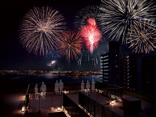 (※4)掲載の屋上テラス完成図は、計画中の図面を基に描いたものです。現地15階相当から撮影した写真(2023年11月撮影)に花火のCG処理を施したもので、実際とは異なる場合がございます。また、眺望は将来にわたって保証するものではございません。