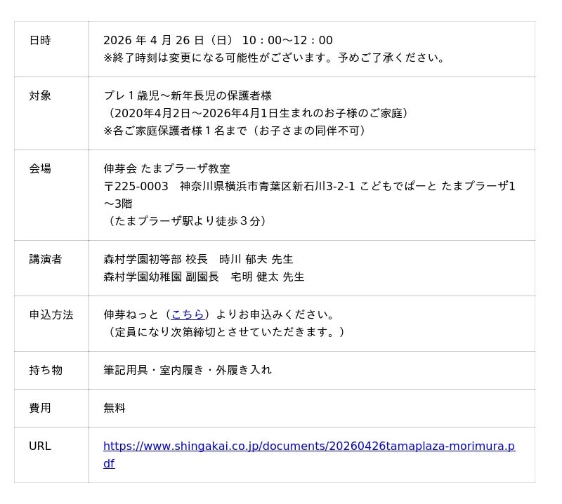 株式会社リソー教育グループ(本社:東京都豊島区、代表取締役:天坊真彦)の子会社である、株式会社伸芽会(本社:東京都豊島区、代表取締役:中西克弥)は2026年4月26日(日)、伸芽会 たまプラーザ教室にて、森村学園初等部と幼稚園の先生方をお招きし、特別講演会を開催いたします。