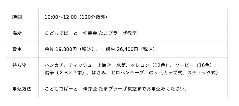 【日時】2026年4月26日(日)10:00-12:00【会場】こどもでぱーと 伸芽会たまプラーザ教室【対象】プレ1歳児~新年長児の保護者様